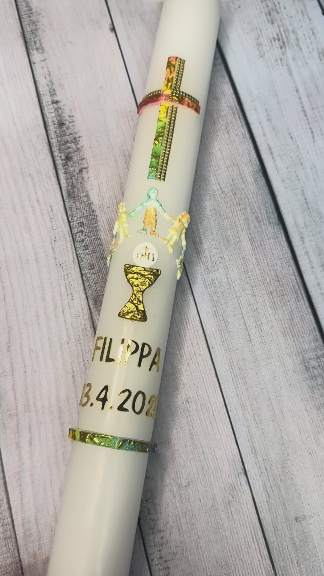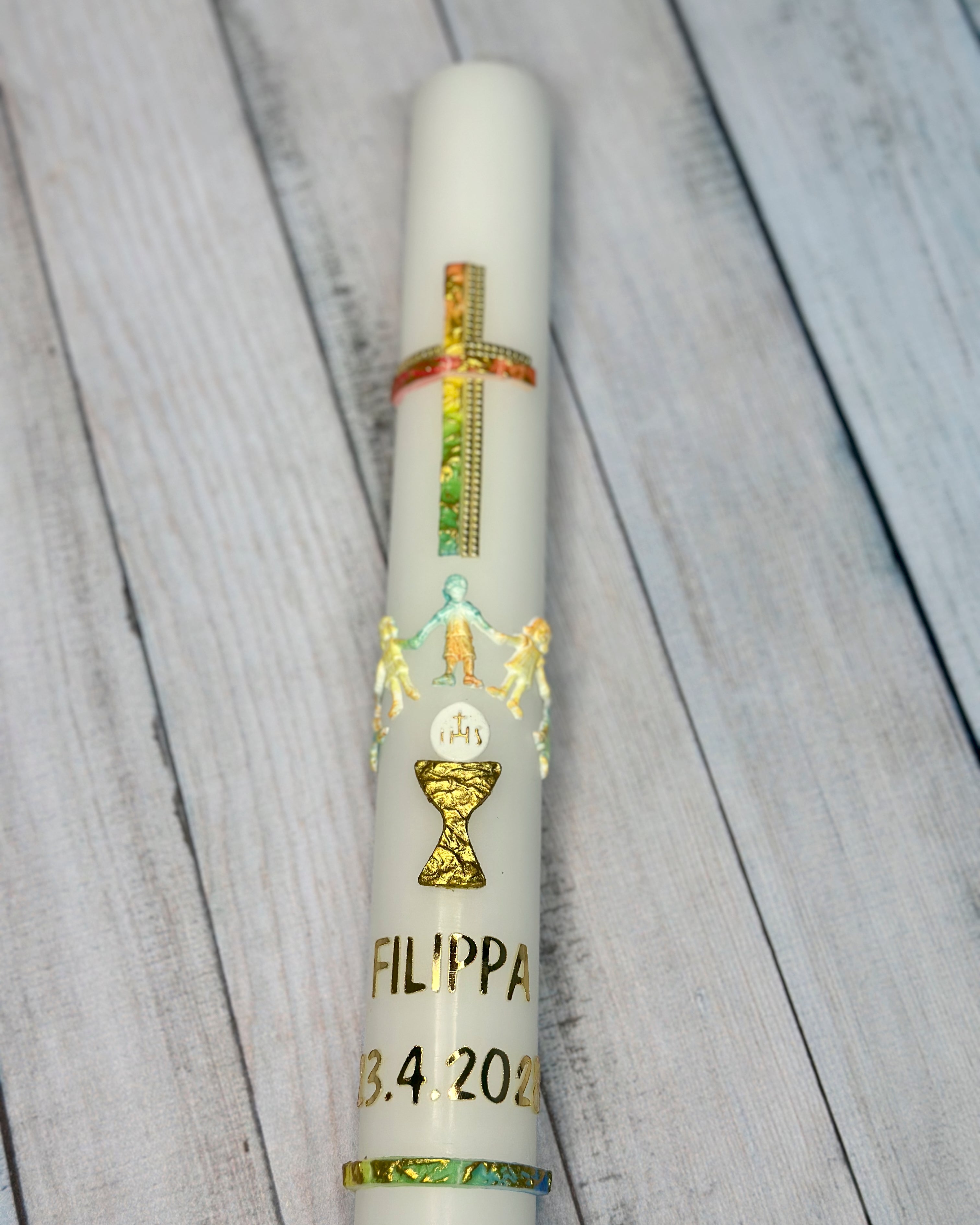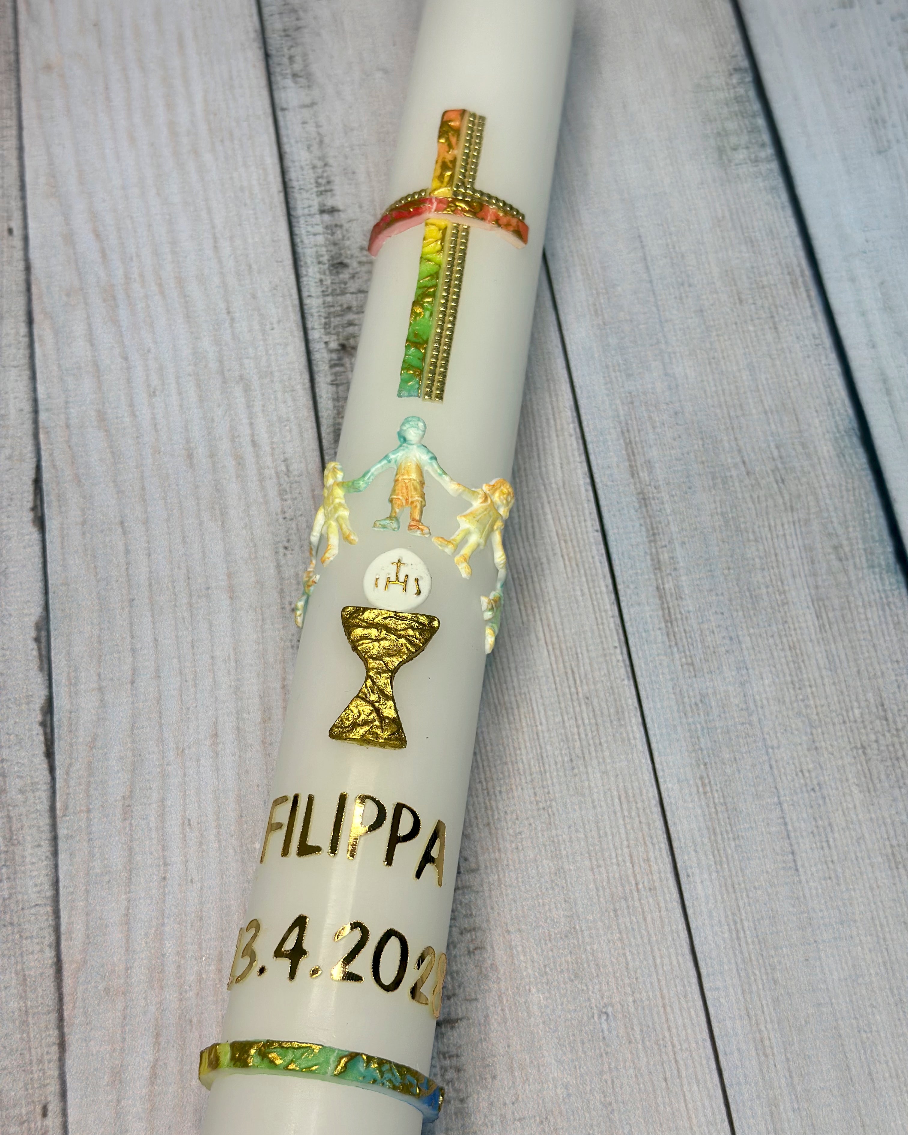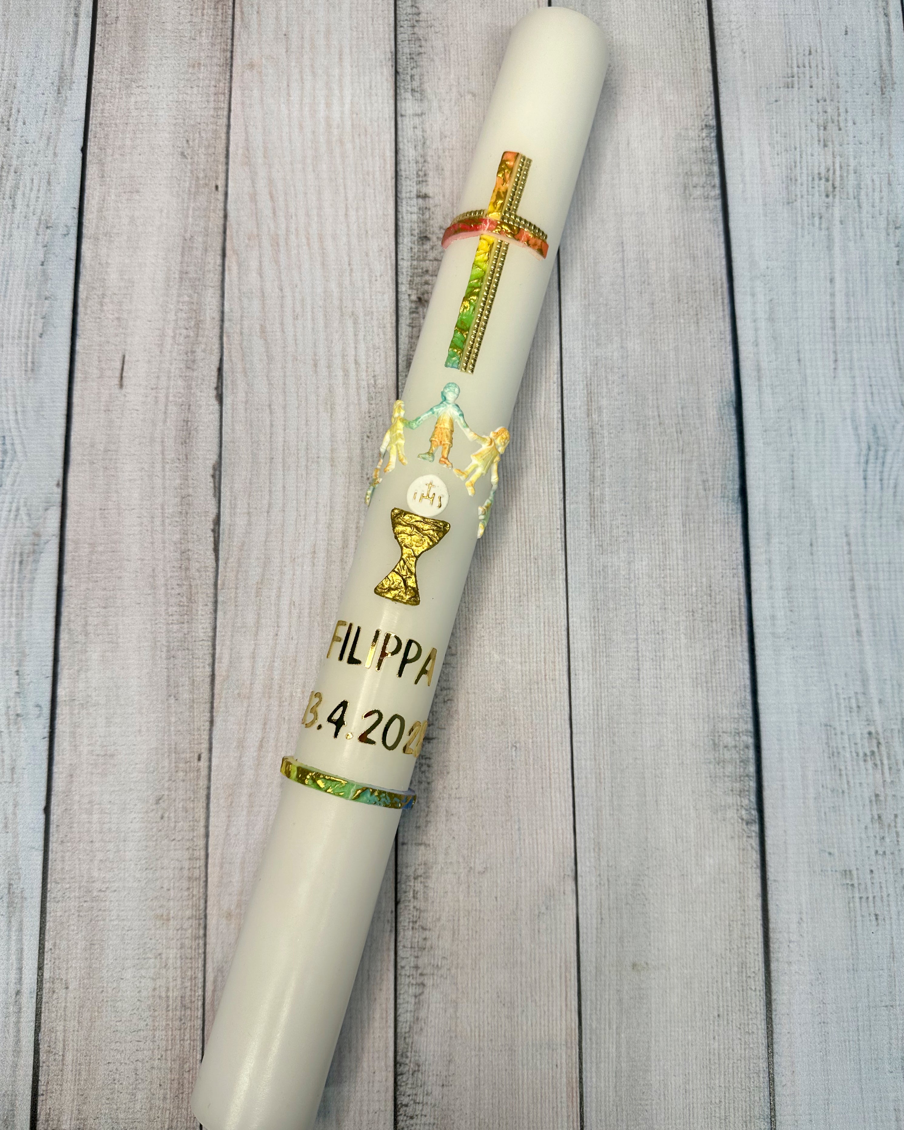 Eine Kommunionkerze (hergestellt in Deutschland) - inklusive einem hochwertigen Karton zur Aufbewahrung und zum Transport in die Kirche - kannst du kostenpflichtig zu dem Bastelset dazubestellen.